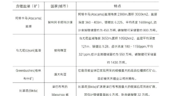 在全球范围内,玻利维亚的锂资源多,大约为 900 万吨,其次为智利(>750 万吨)、阿根廷(650 万吨)、美国(550 万吨)和中国(540 万吨)。固体锂矿为花岗伟晶岩矿床,主要分为锂辉石和锂云母两大类,全球锂辉石矿主要分布于澳大利亚、加拿大、津巴布韦、扎伊尔、巴西和中国;锂云母矿主要分布于津巴布韦、加拿大、美国、墨西哥和中国。