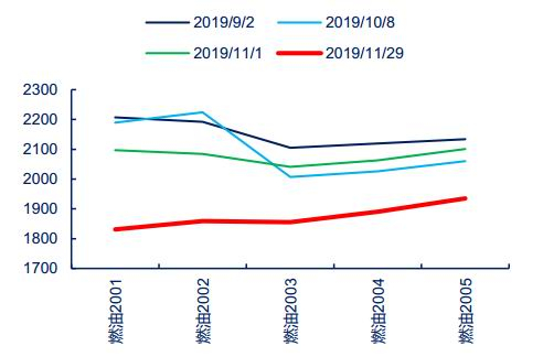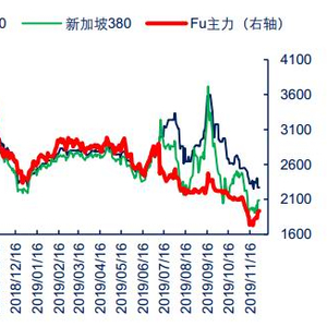 1、IMO临近高硫燃油需求断崖式下滑,高硫燃油价格、贴水和月差加速下跌,悲观预期释放。IMO临近,下半年供需错配(供应降幅大于需求降幅)局面结束,高硫燃油贴水、月差从高位崩塌式下跌,带动Fu加速下跌,内外盘快速回归,新加坡高硫380裂解价差历史低位,高硫燃油悲观预期得到释放。