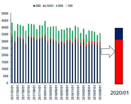 远期曲线来看,IMO临近,新加坡高硫380远期结构向远月升水转变,而新加坡低硫燃油远期结构向远月贴水转变,叠加9月开始,新加坡低硫组分燃油销量快速增长,显示新加坡地区高低硫转换加速进行。舟山和新加坡两地的高低硫价差不断拉大,也显示低硫需求正大幅增长。