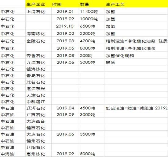 假设当下高低硫价差维持高位,国内炼厂出口退税落实,通过主营炼厂实现低硫燃油供应计划大致有三种路径:一高低硫组分调和,即馏分油和残渣油混调,彭博预测调和成合规0.5%硫含量船燃需要7份0.1%硫含量燃料油和1份3.5%硫含量燃料油或3份0.1%硫含量燃料油和2份1%硫含量燃料油,两种调和方式均对馏分油需求有明显的提振,但目前调和燃油存在兼容性问题,2020年限硫令开始后船东或先选择MDO/MGO过渡;二加工低硫原油,目前辽河石化依托当地低硫原油资源,低硫燃油生产较为成功,2019年计划实现生产23万吨低硫船燃油的攻关目标,2020年实现生产86万吨低硫船燃油的攻关目标;三利用渣油加氢生产,渣油加氢与加氢裂化、催化裂化生产柴油进行高低硫调和区别可能在于前者产低硫燃油粘度更适合船用,兼容性更好,生产成本更低。据资讯机构预估,国内主营炼厂渣油加氢产能7815万吨(不包括恒力、浙石化),产能充足,无非是生产低硫燃料油需要比生产成品油更好的利润,渣油作为催化裂化、加氢裂化工艺的生产成品油的主要原料,一旦去了低硫燃料油,势必会减少汽柴煤油的供应。观察生产低硫船燃的这些炼厂,我们发现大部分炼厂有沥青、燃料油供应,这些炼厂所在省份燃料油产量也较高。我们认为从工艺上看生产低硫燃油对沥青的供应影响有限,更大胆的猜测是生产低硫燃料油减少的是国内燃料油的供应,而对沥青供应影响有限。