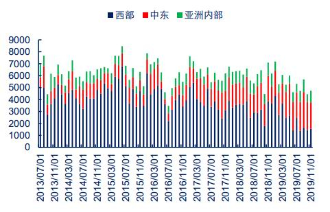 近年来全球燃油供应一直呈现过剩局面(供需缺口为正值),燃油需求有一定的季节性,每年三季度中东燃油需求旺盛,供应过剩缓解。2020年后,IMO使得高硫燃油需求断崖式下滑,供应下降幅度不及需求降幅,燃油供应过剩加剧,EA预测,高硫燃油供应过剩会在2020年一季度达到最高峰。分地区来看,三季度中东的燃烧需求对燃料油市场带来支撑,四季度,亚太地区高硫燃料油缺口大幅缩小,高硫燃油过剩加剧。