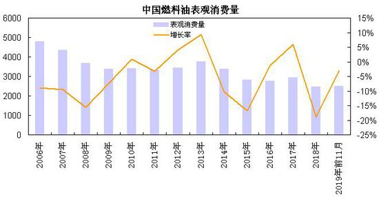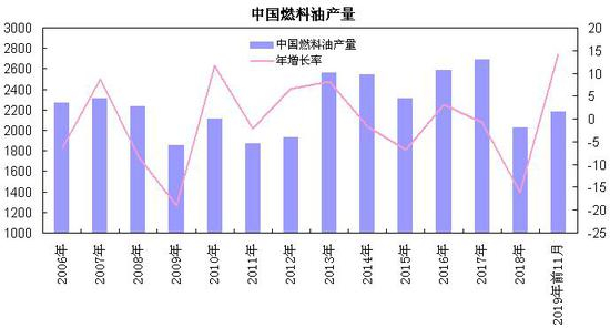 国家统计局数据显示,2019年1-11月中国燃料油产量累计为2178.6万吨,较上年同期增加34.7万吨,累计同比增幅为1.6%;国内炼厂产能继续投产,1-11月原油加工量增幅为6%左右,燃料油产量呈现小幅增长态势。