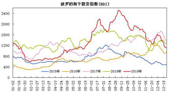 波罗的海贸易海运交易所公布的数据显示,截至12月23日,波罗的海干散货运费指数(BDI)为1103点,较上年同期下降168点,跌幅为13.2%。其中好望角型运费指数(BCI)为1954点,同比涨幅为2.6%;巴拿马型运费指数(BPI)为1154点,同比跌幅为18.8%;超级大灵便型运费指数(BSI)为728点,同比跌幅为25.3%;小灵便型运费指数(BHSI)为494点,同比跌幅为17.1%。2019年BDI指数宽幅运行,一季度从1230点逐步下探至三年低位595点,二三季度,BDI指数从低位逐步回升,9月份触及年内高位2518点;四季度,BDI指数高位回调,重回到年初水平。
