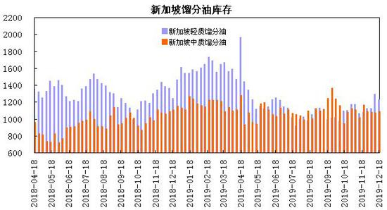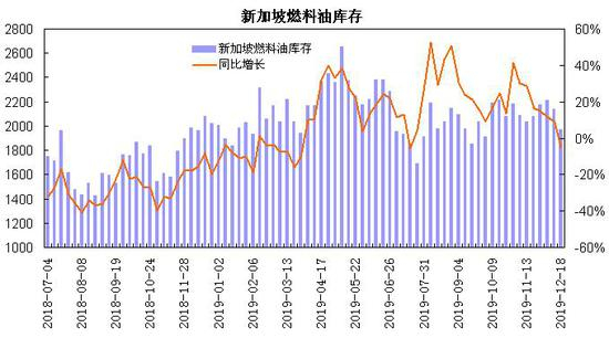 新加坡企业发展局(ESG)公布的数据显示,截至12月18日当周,新加坡包括燃料油及低硫含蜡残油在内的残渣燃料油(沥青除外)库存为1972万桶,同比下降5.3%,较年内高点2649.8万桶下降了677.8万桶,降幅为26.6%。新加坡包括石脑油、汽油、重整油在内的轻质馏分油库存为1226.7万桶,较上年同期下降1.5%;新加坡中质馏分油库存为1087.1万桶,较上年同期下降2.2%。