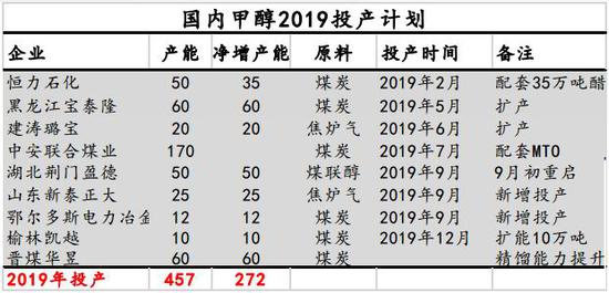 2019年国内甲醇合计9套装置先后投产,合计产能约457万吨,新增产能平均每月贡献产量约13万吨。