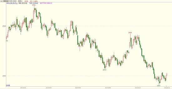 2019年甲醇期货指数价格总体呈现下跌趋势,上半年震荡走弱,6-7月加速下跌,在8-9月有一轮像样的反弹,10月中旬再次开启跌势。