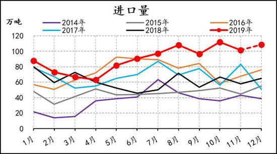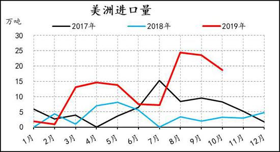 再看美洲地区,由于2018的新增投产和复产,2019年我们从美洲的进口量大幅增加,较2018年每月平均增加9.1万吨。