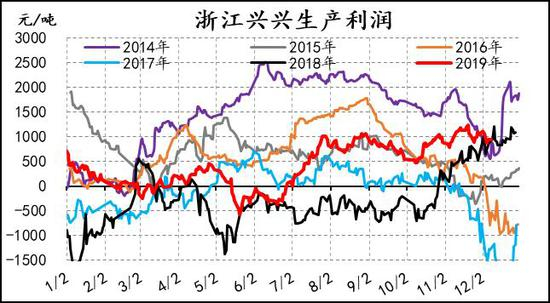从中长期的角度而言,行业利润高低水平和库存水平反向相关。2019年甲醇生产利润持续压缩,观察库存水平发现,全年库存水平持续位于历史同期高位,高库存对价格形成强力压制,造成生产利润压缩,导致价格重心下移。