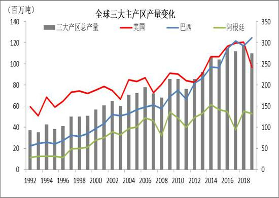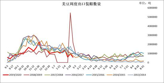 巴西2018/2019年度大豆12月底完成播种,1月中旬早播大豆开始收割,截至2月27日,巴西大豆收割率为40%,略高于五年平均水平,但收割进度落后于上年同期的52%,主要因播种前期受干燥天气影响引起的播种延迟,致使收获进度相应延后,但收割期天气均较为有利,因此机构一致看好巴西新豆产量创纪录,2月份数据显示,Conab预测值调高至1.2325亿吨,比1月份预测值高0.8%;AgRural将巴西2019/2020年大豆产出预测上调至1.256亿吨,创下历史新高,USDA也大幅上修至1.25亿吨,当前产量符合预期的可能性较高,除非天气层面出现较大问题。