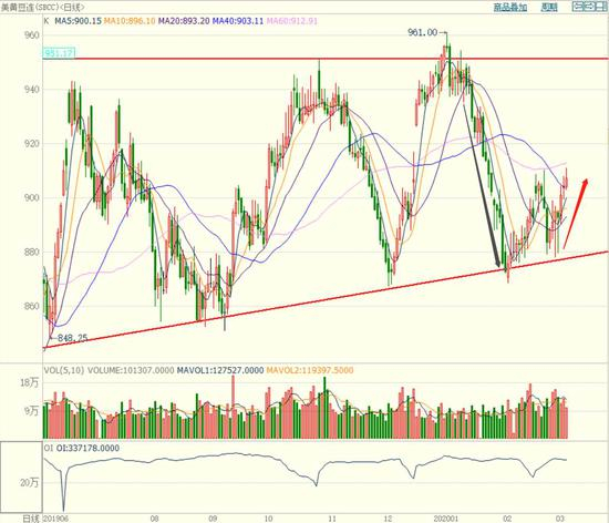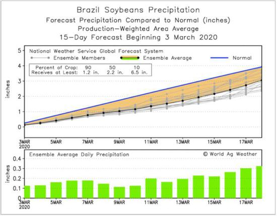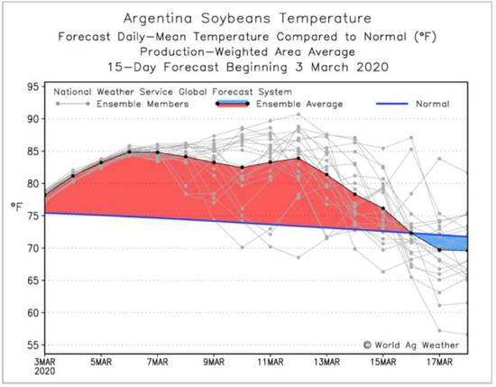 阿根廷2018/19年度大豆1月下旬完成播种,2月全面进入生长期,2月27日布宜诺斯艾利斯谷物交易所发布报告称,阿根廷2019/20年度大豆产量将达到5450万吨,高于早先预测的5310万吨,截至2020年2月26日的一周,阿根廷大豆农田墒情状况充足到理想的比例为68.5%。不过近日阿根廷中部地区天气大体上干燥,气温升高,将耗尽土壤水分,可能给正在鼓粒的大豆作物带来一些压力,继续关注天气题材对豆类市场价格影响。