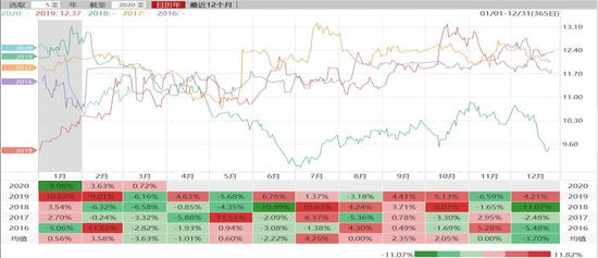 从豆粕期货市场历年价格走势来看,选取2015年到2019年豆粕期货指数价格进行统计分析,得到月度涨跌概率中,7月份上涨概率最大;3月份和12月份下跌概率最大。在各月份与当年价格中,7月份价格多为一年最高,12月末往往达到年内最低点。