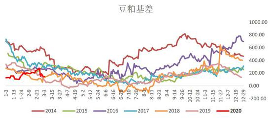 压榨节奏决定阶段性的供应,目前油厂豆粕库存仍还处于较低水平,春节前的备货叠加春节后疫情影响造成的开机延后,交通受阻,下游企业提货意愿增强,致使豆粕库存下降至近年新低水平,截止2月28日当周,国内沿海主要地区油厂豆粕总库存量47.14万吨,周比增加10.57万吨,增幅在28.90%,3月份大豆到港量较少,预计仅有489万吨,市场有传言称中国储备大豆在3月初轮出50万吨,阶段性供需偏紧支撑豆粕现货市场价格震荡,且呈现明显的北强南弱的格局。