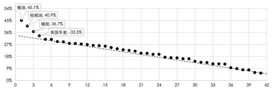 E.若用相关性(绝对值)来衡量影响,可以发现厄尔尼诺对椰油、棕榈油、天然橡胶和美国冬麦(负相关)的相关性具有显著性。即对厄尔尼诺的研究投入,在以上商品的收益产出将显著高于其他商品。其中,棕榈油和天然橡胶为国内期货上市品种。