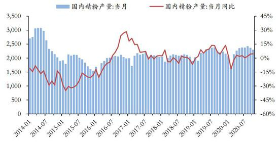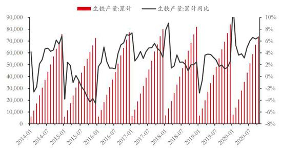 国内需求:2020年,国内疫情控制后,货币政策和财政政策同时发力,上半年成材消费V型反转,下游需求整体维持强势。据华泰期货研究院测算,2020年1-10月,国内生铁产量73,929万吨,同比增加6.6%;预计全年生铁产量将达到89,421万吨,同比增长6.4%。展望2021年,预计国内经济复苏仍将稳步推进,基于中性条件国内粗钢消费增长2%情况下,据华泰期货研究院生铁产量模型测算,预计明年全国生铁产量91,381万吨,同比增加2,027万吨或增长2.2%,国内铁矿石需求预计增加3,200+万吨左右。