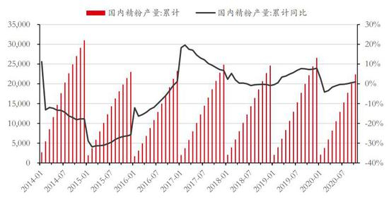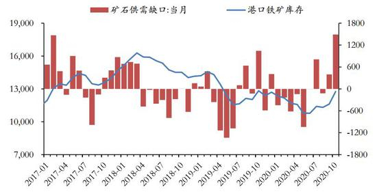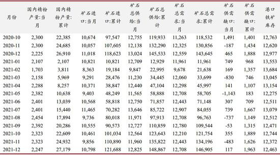 回顾2020年铁矿供需情况,供给方面,受天气、海外疫情及巴西vale溃坝后生产恢复缓慢,进口矿的增量主要来自于日韩的转口,以及部分地区比如印度等国家的增量,而国产矿增量很有限。到2020年底全国45港库存恢复到1.3亿吨附近,大概率是暂时的天花板;需求方面,环保设备升级,高炉开工率居高不下,2020年前10个月生铁累计同比增长6.6%,不但消耗了日韩转口的铁矿增量,而且在6月中旬之前铁矿港口库存一直处于去化状态。另外,铁矿品种间也存在结构性问题,大半年来最紧缺的是粗粉,粗粉的缺口自8月下旬才开始陆续补起来。中国一枝独秀,对铁矿强劲的需求,导致铁矿大部分时段处于紧平衡格局,弥补了海外高炉减产对铁矿所带来的负面影响。