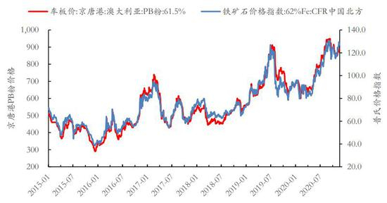 图3:京唐港PB粉与普式指数走势图 单位:元/吨,美元/吨