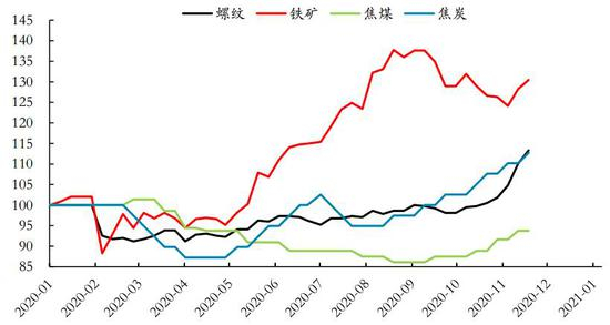 2020年,黑色商品现货价格整体呈先抑后扬态势,疫情初期,煤焦现货价格相对坚挺,而螺矿现货价格出现大幅下挫,铁矿石现货价格一度下跌超12%。而随着国内疫情的得到控制,国内钢材消费恢复,钢厂加大生产力度,铁水产量一路提升,铁矿石现货价格出现大幅上涨。至8月底,铁矿现货价格年内上涨幅度接近38%,随后铁矿石现货价格于9月中旬开始出现回调,回调至11月上旬再度反弹,截至11月20日,铁矿石现货全年上涨30%。而普指年内亦创去年矿难以来新高,现阶段维持高位震荡。