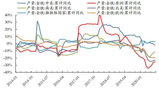 图14:全球主要国家和地区全铁产量增速 单位:%