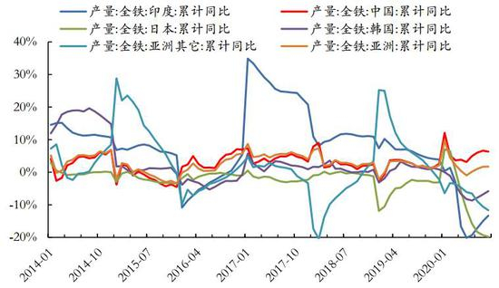 海外需求:据世界钢铁协会发布数据,2020年1-9月,全球粗钢产量为134,926万吨,同比下降3.1%,其中,亚洲地区的粗钢产量为100,348万吨,同比增长0.4%;欧盟地区的粗钢产量为12,736万吨,同比下降14.5%;北美地区的粗钢产量为7,405万吨,同比降低18.2%;独联体地区的粗钢产量为7,430万吨,同比下降了2.5%。同样,统计数据显示,2020年全球全铁产量也在疫情影响下下滑,1-9月全球全铁生产102,117万吨,同比下滑2.7个百分点,除中国外全铁生产36,338万吨,同比大幅下降12.4%。2020年,全球钢铁业生产受疫情影响大幅放缓。印度、欧盟、日本、北美、南美等的全铁产量都出现大幅下滑。