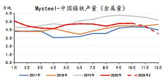 按此情况推演,需要再次考虑印尼禁矿后,印尼镍矿的缺口是否能由其他镍矿来源国进行补给,其中新喀里多尼亚给出了较为乐观的答复。当前新喀里多尼亚已开发的红土镍矿资源量还不到其可开采储量的一半,而且新喀里多尼亚镍红土矿品位高、储量大、埋藏浅,适于露采。虽然新喀里多尼亚镍矿主要供应新喀境内冶炼企业,出口为配额制,出口量相对较少,但未来将新增100湿吨镍矿出口量。法国矿业公司Eramet表示,政府允许SLN出口中低品位镍矿石将有利于SLN项目削减成本,预计到2021年可削减SLN的现金成本1.30美元/磅。SLN项目的镍矿具体出口配额数量将在400万吨/年左右,至2021年可达到年产300万吨红土镍矿。2021年新喀的镍矿回流能力有望达到500万湿吨,潜在弹性甚至可以达到600万湿吨。保守估计实际镍矿回流量在450万湿吨左右,折合金属量5.27万吨。2020年1至10月份新喀里多尼亚出口至中国的镍矿约为183万吨,全年乐观估计也就220万吨左右,远远未达到配额的限制和年初的预期,预计的450万吨回流量将超过2020年的2倍,对于镍矿供应来说将是一波较大的补充。但是以较乐观的情况估算,新喀里多尼亚的回流预期全部实现,加上来自菲律宾的进口增至720船,再假设印尼方面能够保持2020年的对重出口量约350万吨折合成金属量约4万吨左右,全部折合成金属量也只有42.25万吨左右,这还是不算冶炼能耗的情况。而中国2020年NPI全年产量折合成的金属量就达到了53.2万吨,镍矿明显依然处于供不应求的状态,实际上2021年国内NPI产量可能继续下滑至40万吨左右。