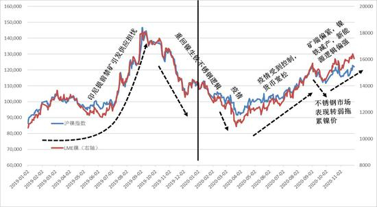 2020年总体趋势先抑后扬。2019年末随着禁矿消息实锤落地以及镍价涨至近三年高位后,缺乏更强的上涨驱动。随后市场理性回归镍生铁-不锈钢产业链逻辑,价格应声回落,跌势异常流畅。而2020年1季度在刚刚从上一波跌势中缓过劲儿来的情况下又受到了疫情的冲击,镍价开始新一轮的暴跌。2-3月份疫情对下游企业复工造成重创,终端消费下滑,叠加印尼镍铁大量回流,国内NPI过剩加剧,在供应过剩需求不足的共振之下,不锈钢社库累积创历史新高,镍价也跌入谷底。之后疫情受到控制,货币政策宽松,国内消费端开始复苏,终端存在报复性的消费现象,而当时菲律宾镍矿供应矛盾升级,镍铁价格上涨,又与消费复苏形成共振,叠加三季度后半段的原料低库存,镍价迅速恢复。直至9月份,不锈钢市场表现转弱,需求不足导致镍价终于结束上涨进行回调。原料市场的回落,和不锈钢消费不及预期,导致情绪大幅回落。再之后菲律宾进入雨季,镍矿季节性减产,而2020年菲律宾雨季影响格外严重,经历了双台风,镍矿再次转入偏紧。进入11月后矿端偏紧,镍矿价格高企,造成一部分镍铁企业主动减产。同时,宏观方面美国政府开始交接,疫苗消息利好,对于未来经济形势好转的强烈情绪拉动整个有色板块上行。而不锈钢需求下滑,整体价格处于宽幅震荡偏强的状态。