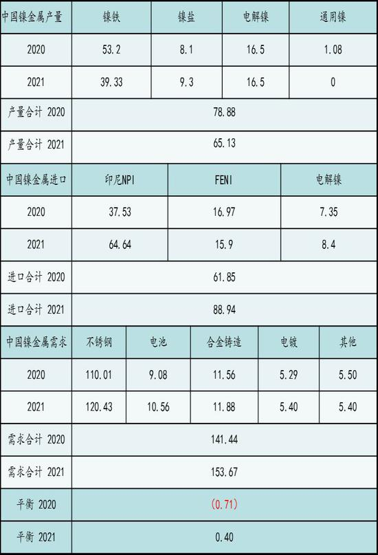表1:全球和中国原生镍供需平衡表