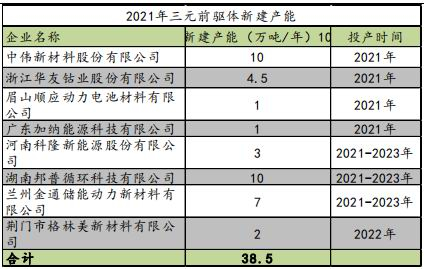 表10:2021年三元前驱体新建产能