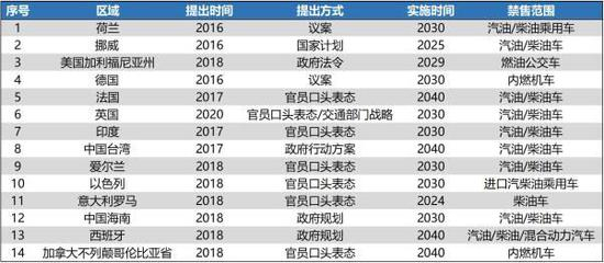 表9:全球各国政府新能源汽车渗透计划