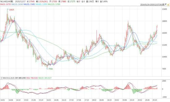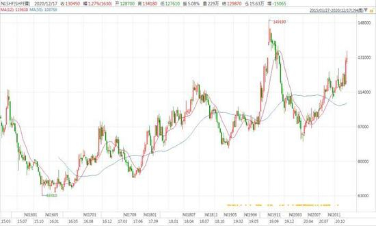 技术面上来看,2020年锌价总体呈先抑后扬的态势,尤其是三月份之后基本成稳定的上涨态势,LME锌价来看,当前已经突破年内高点,且看趋势又继续向上突破的可能。LME压力线大约在19000美元/吨。由于国内镍期货上市时间比LME相对较晚,压力线看144700元/吨,而下方基本不可能回到疫情时期的低点,支撑线在95400元/吨,LME支撑线大约在11900美元/吨。