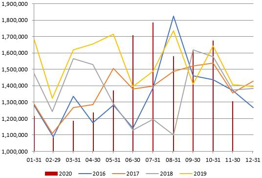 棕榈油食用需求方面,主要体现在印尼、马来出口贸易数据上,整体来看,印尼、马来2020年1—11月出口受新冠疫情、产量下滑影响不敌2019年同期,且第一季度出口量羸弱,马来出口对印尼市场有挤占。印尼棕榈油出口数据全年弱势,第一、二季度尤为明显,后期有所恢复,但力度相对历史同期较弱,出口旺季8月出口量仅268.3万吨,同比2019年下滑7.2%,同比2018年下降18.6%;马来棕榈油第一季度出口受主销区疫情封锁影响遭遇滑铁卢,二季度后出口逐步恢复,6月迎来爆发式增长,出口量增至170.7万吨,较2019年同期增加22%。