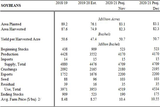 因2019/20年度销售不畅,农户种植信心未恢复;2020年8月份,美国中西部出现干旱、风暴天气,美豆优良率下降,2020/21市场年度美豆产量仍未恢复到贸易战前的2018/19年度。根据USDA12月月度数据,2020/21年美豆种植面积83.1百万英亩,较上一市场年度的76.1百万英亩有恢复,但仍低于2018/19年的89.2百万英亩;本市场年度美豆单产50.7蒲式耳/英亩,仅次于史上最高产年份2016/17年度的51.9蒲式耳/英亩;产量41.7亿蒲式耳,高于上一市场年度的35.5亿蒲,处近五年产量的第二低位。此外,受2020年美豆价格上涨、销售火爆,农户下一年度大豆种植积极性将受鼓励。