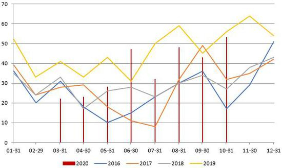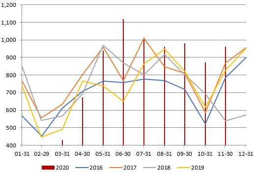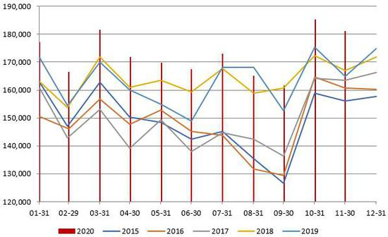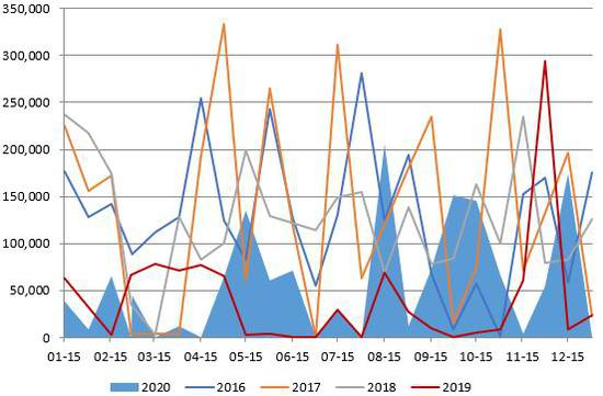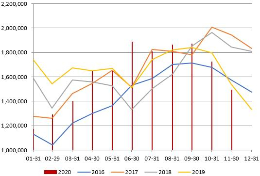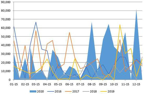 2020年,马来西亚棕榈油整体呈减产趋势,其中,一、四季度减产明显,第一季度产量趋势上符合季节性减产周期,但绝对值上低于前三年产量,主要受累于2019年第二季度相对匮乏的降雨量,一季度累计产量385.7万吨,同比去年减少22.1%;第四季度受主产区疫情影响,10月份产量逆季节性增产周期出现减产,后期叠加减产周期到来亦呈江河直下之势。因产量不济,马来西亚库存全年整体处近五年低位,截至11月,库存降至156.5万吨,低于2016年的166.4万吨。