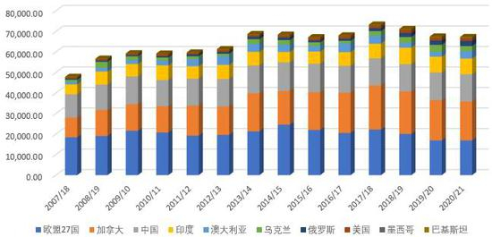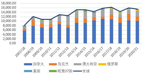 全球菜籽供应结构方面,欧盟、加拿大、中国、印度、澳大利亚、乌克兰、俄罗斯是全球菜籽主产区,其中,欧盟、加拿大产量占比达50%以上;中国、印度产量次之,但菜籽自身供应不足;澳大利亚、乌克兰、俄罗斯产量占比仅11—13%。出口结构方面,加拿大、乌克兰、澳大利亚三国占全球出口占比超过90%,其中加拿大占比60%以上;趋势上,加拿大出口绝对值占比近年有所下降,澳大利亚、乌克兰趋升。下游菜油出口方面,加拿大仍是全球最大的菜油出口国,占比65%以上,俄罗斯、欧盟次之。根据USDA预估,2020/21年度全球期初库存方面,菜籽库存702万吨,同比降低27%,菜油库存245万吨,同比降7.5%;全球产量方面,菜籽产量6887万吨,同比去年降0.1%,菜油产量2764万吨,同比降1.2%;全球库存消费比,菜籽低位持稳,菜油仍处下降趋势,低至0.07。加拿大方面,2020/21年菜籽期初库存313.1万吨,同比减少29.4%;产量1900万吨,同比降低3.1%;出口1000万吨,同比减少2.9%;压榨量994万吨,同比减少1.9%;库存消费比0.09。综上,2020/21年度,全球菜籽、菜油产量减少,去库存或持续;主要贸易国加拿大期初结转库存偏高,但新年度遭遇减产,其国内需求旺盛,料对外可供应量有限。