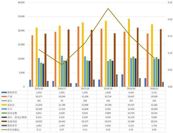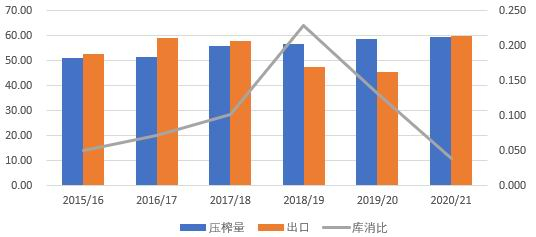 2020年,因前期干旱、施肥量减少及疫情限制外籍工人返岗等因素造成马来、印尼棕榈油减产,特别是马来全年库存低位,这也是棕油盘面大幅拉升的重要原因。2021年,受拉尼娜强降雨及一季度季节性减产周期影响,预计棕榈油一季度延续当前低库存,但后期马来、印尼棕榈油产量或呈恢复性增长状态。