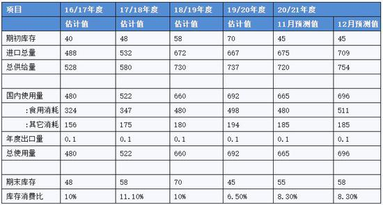南美方面,阿根廷主要出口大豆压榨后成品,大豆销售方面因阿根廷比索贬值农民惜售;巴西以大豆销售为主,往年出口量基本维持在60%以上,压榨量于35%附近波动,但2020年因中国买家购买量远超预期,巴西供国内压榨大豆可用量十分紧俏,企业不得不进口大豆来满足国内需求,按照ABIOVE的预估,2020年巴西大豆进口量达100万吨,同比去年增加5.9倍;年度库消比降至0.002,为近十年最低值。截至10月,巴西大豆库存降至811.4万吨,较2019年同期890.5万吨减少8.9%。