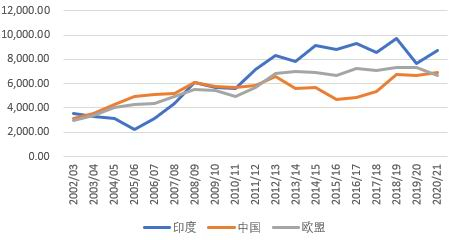 棕榈油贸易流下游主要是印度、中国及欧盟,2019/20市场年度进口量比值35:31:33,绝对值均有不同程度回落。印度方面,因与马来政治贸易摩擦因素,棕榈油2020年第一季度进口量降至冰点33.6万吨,而2019年同期进口量达80.2万吨。相应的,印度2020年4月油脂库存降至历史同期最低点91.5万吨,后期随着进口量的回升补库至11月的143.1万吨,但仍低于2019年的195.1万吨。2021年,印度棕榈油进口量预计有所恢复,主要基于以下两点原因:一是,印度自11月27日起,将毛棕榈油进口税率从此前的37.5%降至27.5%,也就是说从政府方面是鼓励棕榈油的进口的;二是,考虑到印度现在的油脂低库存,新冠若解封后印度存在更高的补库需求。而中国需求同比持平或略增,欧盟棕油食用需求可能受新的食品安全标准会面临下降。根据USDA预估,2020/21年度,全球棕榈油主要进口国进口量预计同比累计增加2.8%,增幅主要来自于印度和中国,分别为14%和3%,欧盟环比降8%。