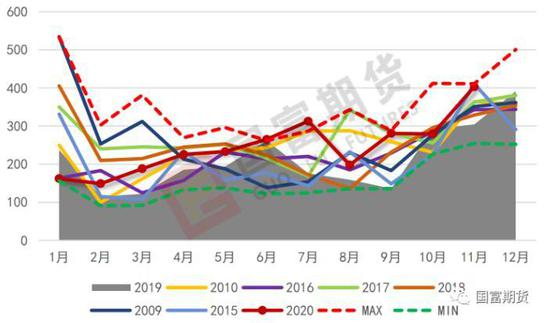 2020年,国内棕榈油呈去库存状态,除豆、棕油价差扩大导致替代等因素外,国内棕榈油供需受疫情影响较大,供应方面,春节前后因国内新冠病毒高峰,国民经济活动近乎停滞,餐饮消费严重受挫,棕榈油3月进口量降至历史最低水平22万吨,后期随着国内疫情受控,棕榈油进口量逐步恢复,但马来产地尤其是棕油最大产出地沙巴州疫情反复,导致出货慢、到港多次延期;需求方面,据调研了解,棕榈油需求流向因疫情影响发生显著变化,方便面等工业食用消费大幅增加,生物柴油用量因利润不佳大幅下滑。数据方面,棕榈油1—10月累计到港498.5万吨,同比去年降低24.5%;截至2020年12月18日,港口库存55.62万吨。2021年,疫情持续与否仍是国内供需变化的重要影响因素,若产地疫情有反复,则供需复制2020年状态,但考虑到产地产量恢复性,2021年进口利润或好于2020年,因此国内2021年供应略好转;若疫情结束,供需恢复至往年正常状态,供应增加,需求持平或略增,库消比上升。此外,棕油需求季节性明显,棕榈油因其高熔点特质,冬季调和油使用受限,消费整体偏弱,但广东地区因气候原因消费季节性影响相对较小。