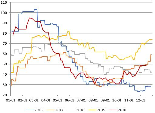 棕榈油制生物柴油需求方主要是印尼、马来西亚和欧盟,目前,印尼、马来的掺混比率政策分为B30、B20,预计累计吸收两地1000万吨棕榈油;欧盟受新冠病毒及《可再生能源指令Ⅱ》政策的影响棕榈油制生物柴油遭遇滑铁卢。从历史数据来看,印尼生物柴油政策无论是从政策力度还是实施效果都要强于马来,因此市场主要关注点在于B30政策能否顺利实施。在此,需考虑两方面因素,即产能和补贴。目前,印尼产能已超113亿升,B30计划生物柴油额度定为95.9亿升,因此产能方面无阻碍;印尼补贴资金来源于印尼棕榈油出口税收,补贴额取决于POGO价差,但2020年POGO价差处全年高位,7月后脱离[170,230]震荡区间上冲至高位473美元/吨,截至12月17日,POGO价差430美元/吨,高于历史同期2019年的74美元/吨、2018年的-82美元/吨,目前市场对CPO基金能否支撑政策实施存怀疑态度,不过自12月10日开始,印尼毛棕榈油出口征税从之前的55美元/吨增长至180美元/吨,对市场信息有些许提振,后续关注实际实施效果。