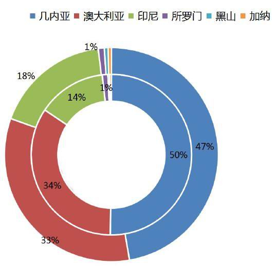 图:2019-2020年海外铝土矿铝进口占比(内圈为2019年,外圈为2020年)