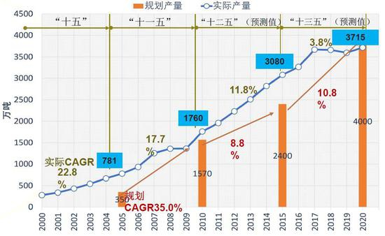 图:2000年以来中国电解铝规划产能及实际产量情况