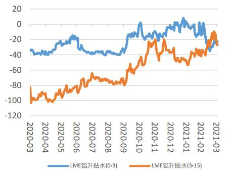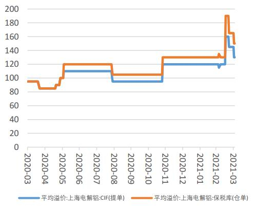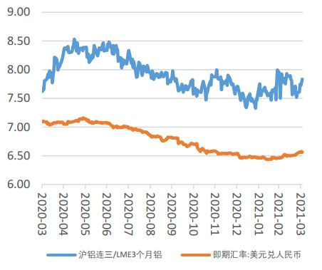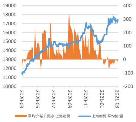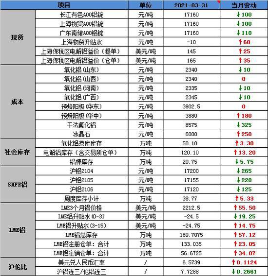 3月份,国内铝价高位整理,沪铝2105合约最高接近18000元/吨一线,续创新高;LME铝价上涨2.57%,走势强于国内;沪伦比回落至7.73附近。现货方面,3月份长江有色A00铝锭累计下跌100元/吨,上海物贸A00铝锭累计下跌100元/吨,上海物贸升贴水累计上涨60元/吨,现货价格整体保持强势。