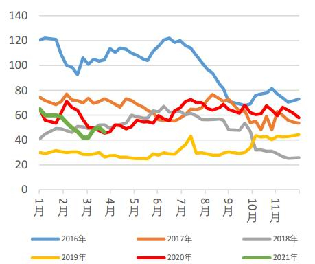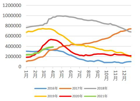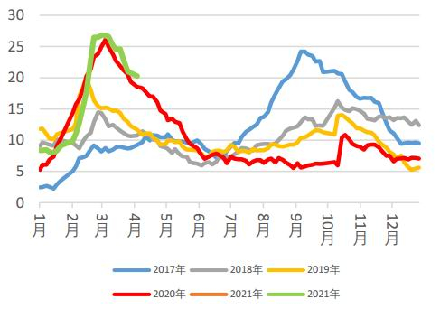 回顾2021年一季度国内铝棒市场,加工费整体先跌后涨,但整体处于低位徘徊之势,除2020年初逢国内疫情爆发,封锁城村、企业停工接踵而至,下游需求迅速萎缩下铝棒加工费创历史新低外,2021年2月中旬至3月中旬国内铝棒加工费算是处于2018年以来历史低位。究其原因,第一、寒冬之年北方地区基建项目停工相对较早,建材市场提前进入萎靡期,北方部分企业订单季节性减少;第二、元旦前后河北疫情的爆发导致全国型材企业春节放假时间提前同时复工时间相对较晚,铝棒需求疲软;第三、铝价高位震荡,更是在3月16日创得10年高位17760元/吨!下游畏高情绪严重,年前备货者不及往年,年后刚需采购为主;第四、春节前后铝棒库存累库速度较快,2月中旬至3月中旬全国铝棒社会库存持续处于三年历史高位,3月4日全国铝棒社会库存量高达24.63万吨,较前高21.89万吨增长12.5个百分点,故铝棒持货方以去库为主,出货积极。故一季度铝棒加工费一直萎靡不振,低位震荡。