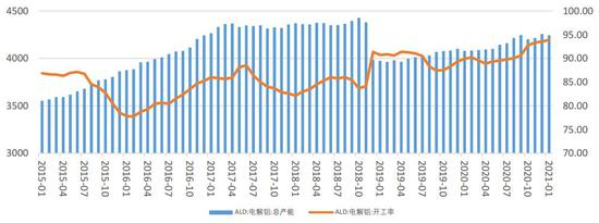 图21 国内电解铝总产能(万吨)及开工率(%)