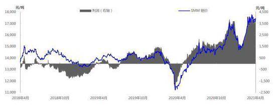 SMM预期2021年的复产总产能在40-50万吨之间。对于新增产能方面推动不会特别明显,主因投产需要考虑电力,资金等多方条件,所以新增产能按部就班投产,全年预期在180万吨附近。高利润对于电价的直接影响并不明显,电价主要受煤价和铝价影响,铝价高企会带动部分地区上调大工业用电价格,如青海、甘肃等省,不过此部分产能占比相对较小。对于后期电解铝利润而言,SMM认为相对于1季度铝厂利润,未来三个季度铝厂利润略有收窄,但整体利润水平仍然处于高位。一方面铝价下跌空间不会特别大,整体运行16500-17500元/吨;另一方面我们成本上涨速度不会很快,氧化铝和电力等原材料价格上涨间接会助推部分成本上移,但平均成本上浮区间也就在500元/吨附近。