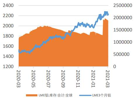 图3 LME3个月铝价(美元/吨)及库存(吨)