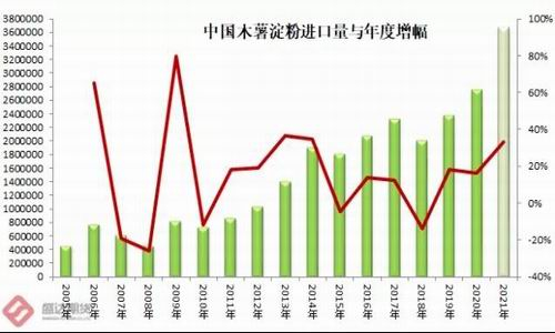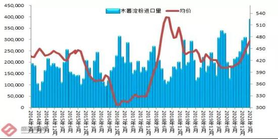 2021年3月,我国进口木薯淀粉38.4万吨,环比增幅66.44%,同比增幅26.79%。前三个月小计出口91.8万吨,同比增幅39%。若按照前三个月月均进口量30.6万吨来推算,则2021年木薯淀粉总进口量在367万吨,同比增幅将在33%。