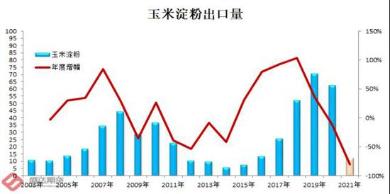 若按照前3个月月均出口量1.0252万吨推算,则2021年玉米淀粉总出口量在12.3万吨,降幅80.25%。