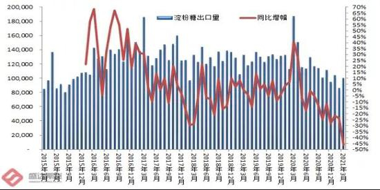 2021年3月中国出口淀粉糖10万吨,环比增幅16.93%,同比降幅46.3%。1-3月小计出口量29万吨,同比降幅32.84%。