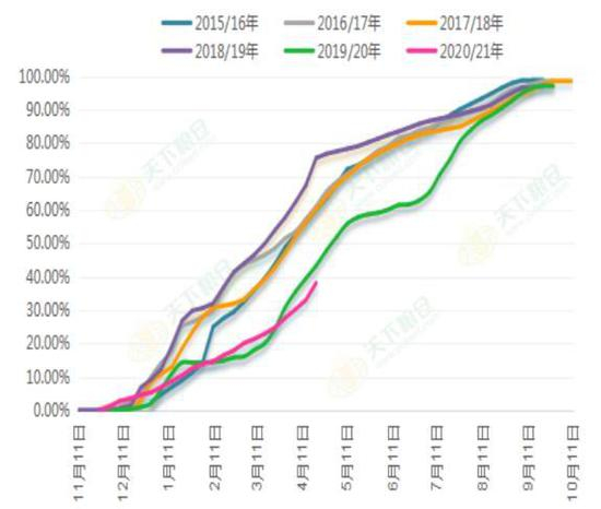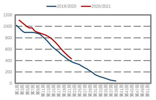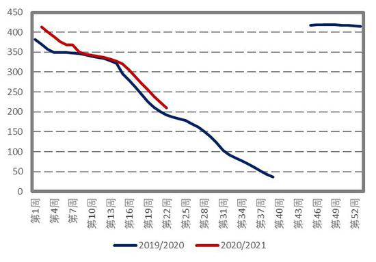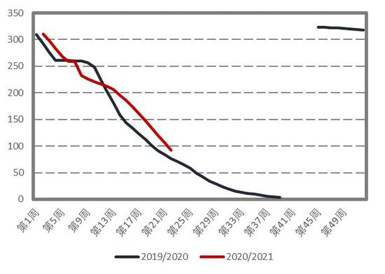 首先是出库速度下降。山西地区前期降价去库力度大,走货速度很快,但目前余货已经不多,出库放缓,此外,由于新季苹果已经进入套袋期,产区果农忙于套袋,冷库包装的工人比较短缺,交易情况略显一般;其次,天气炎热导致库存苹果的质量已经出现虎皮等问题,客商采购次果的积极性降低,于是次果鲜有问津,反而是好货走货速度在放快。目前好果不多,果农有惜售情绪,部分产区的价格略有翘尾,这也属于正常现象。考虑到目前的库存以及每况愈下的质量,预计走货速度仍将高于往年同期水平,以消化剩余库存。按当前的出货进度,预计今年库存消化的时间要比去年多出2-3周左右的时间。我们需要关注后期出货速度与时间窗口的博弈,以及可以作为新季苹果开秤价格参考的旧季苹果的收尾价格。