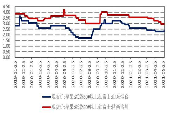 山东省和陕西省是苹果的主产区,当前主产区的冷库苹果库存量皆高于去年同期水平。卓创资讯的数据显示,截止5月27日,山东地区的苹果库存量约为209.94万吨,高于去年同期17.65万吨;陕西地区的库存量在106.37万吨左右,比去年同期的76.75万吨多出15.39万吨。